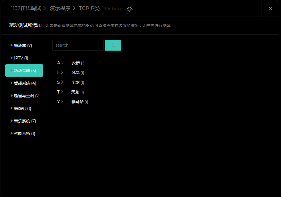 选择“网络接口”-“tcp/ip类”点击添加按钮。找到“功放音响”点击添加,然后编辑好天龙的参数信息之后。点击添加