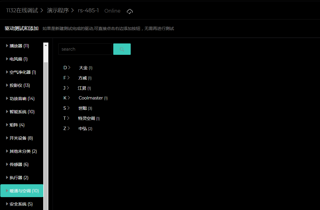 点击“rs-485-1”(注意和实际的端口一致),点击“添加”,找到暖通和空调类,找到”暖通和空调(7)”,点击添加,最后点击添加即可。