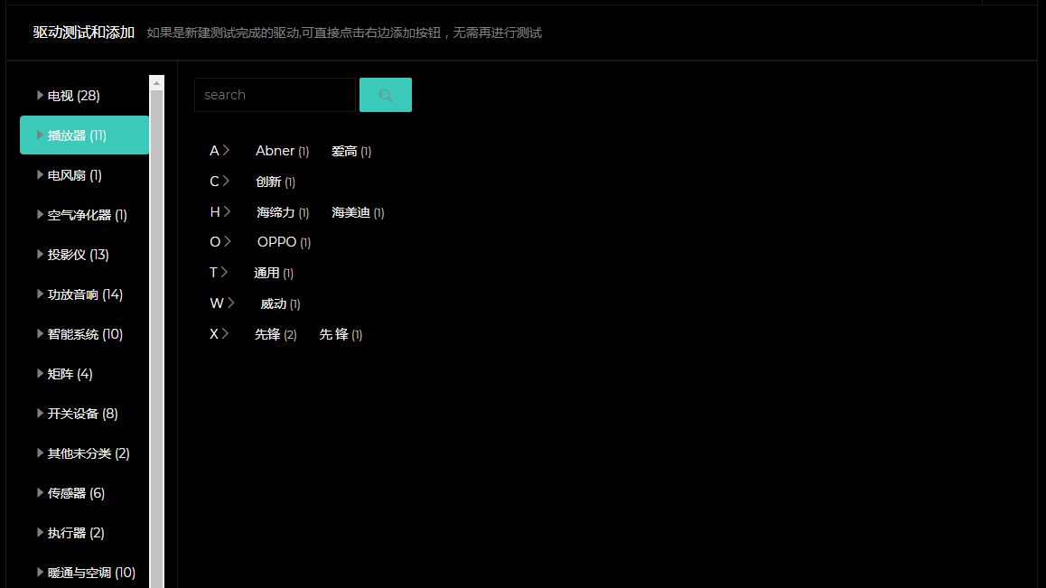 点击“rs232”,点击“添加”,选择“播放器”分类。点击“海美迪”,点击“+”,最后再点击保存即可。