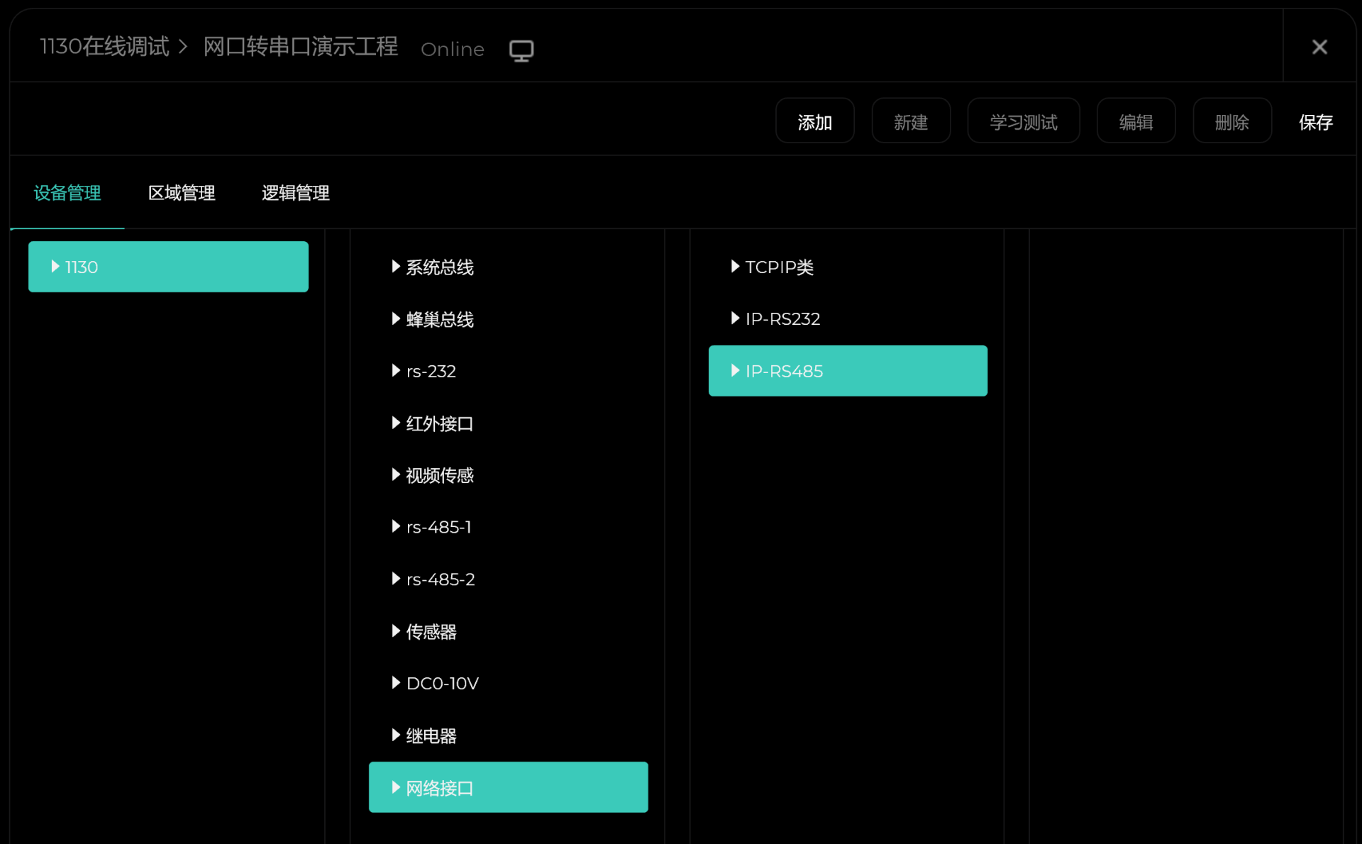以下以常见的RS-485扩展为例,先创建工程如“网口转串口演示工程”,并在“网络接口”->“IP-RS485”添加一个“无线蓝牙”驱动
