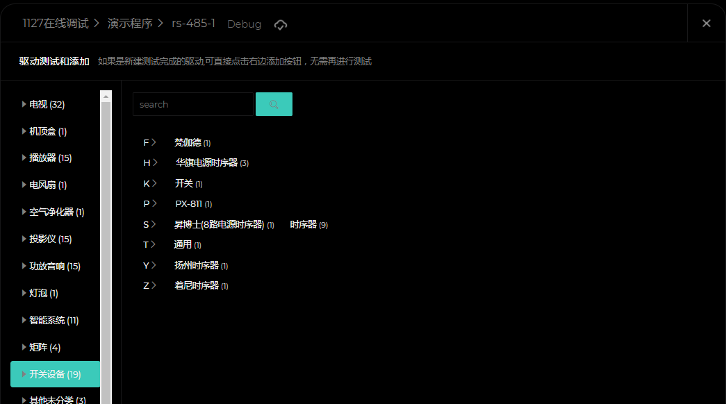 在区域管理页面 点击一个房间 点击添加,选择客制分类,勾选双模时序电源,点击添加,最后点击保存,点击调试模式,编译下载即可。