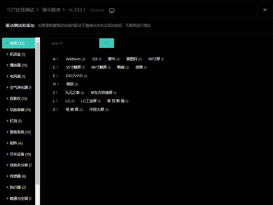 点击rs-232 ->点击添加->选择电视分类->98寸屏(1),点击+ ,点击保存,在设备管理页面再次点击保存。