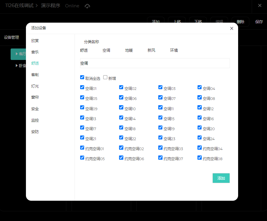 2)进入区域管理,选择一个房间,点击“添加”,点击“舒适”,选择分类名字和驱动,点击“添加”。