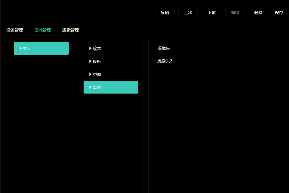 添加完成后,点击保存,自动跳转到区域管理界面,将设备管理界面添加的摄像头添加到对应房间中去